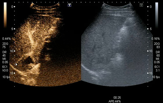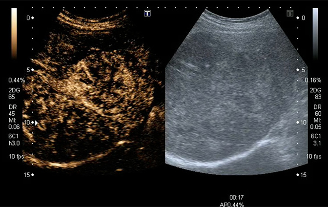 La aparición de los contrastes ecográficos (CE), constituidos por microburbujas de gas estabilizadas con otras sustancias ha supuesto una revolución en el diagnóstico ecográfico de muchas enfermedades. En Europa están aprobados pocos contrastes para uso radiológico: Levovist ® que está compuesto de aire con galactosa y ácido palmítico como agente tensioactivo y SonoVue ® (Bracco), compuesto por hexafluoruro de azufre con una cápsula de fosfolípido. La baja solubilidad del hexafluoruro de azufre junto con su mayor estabilidad permite realizar estudios en tiempo real con SonoVue ® , cuando se utiliza un índice mecánico bajo sin destrucción de las microburbujas. Principalmente está reconocida su utilidad en la caracterización de lesiones focales hepáticas, el control postratamiento percutáneo de tumores y la valoración de la perfusión parenquimatosa de diferentes órganos, incluyendo enfermedad traumática, infecciosa o isquémica.